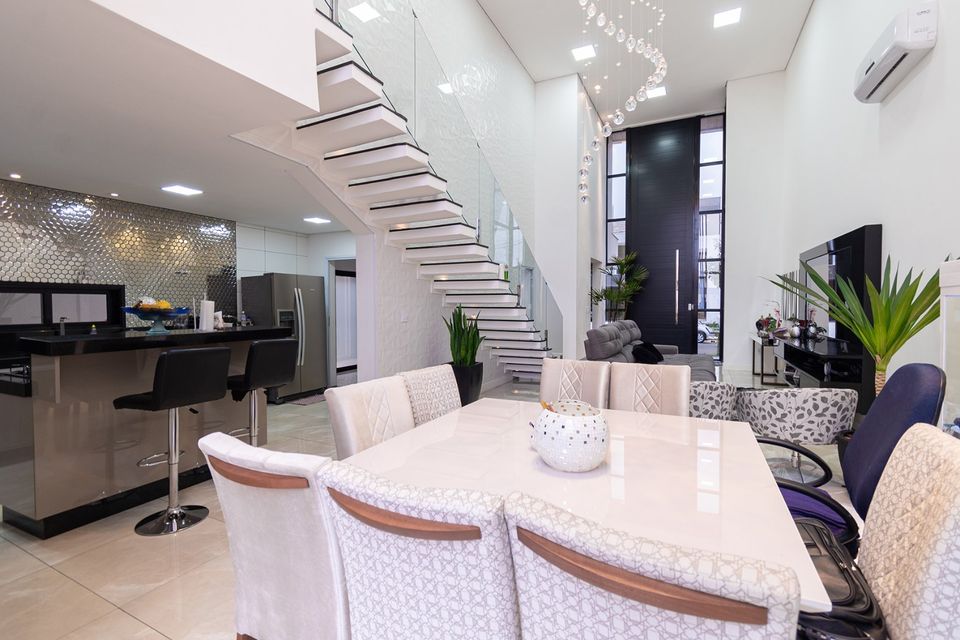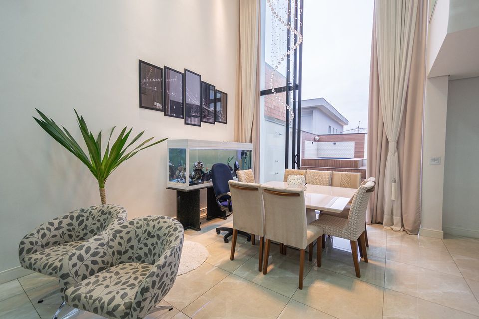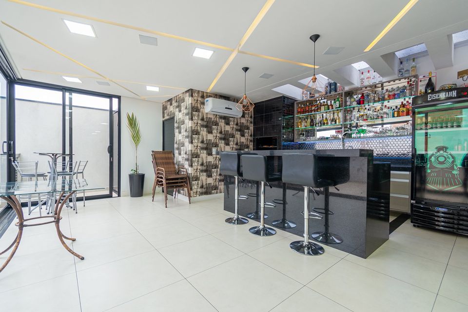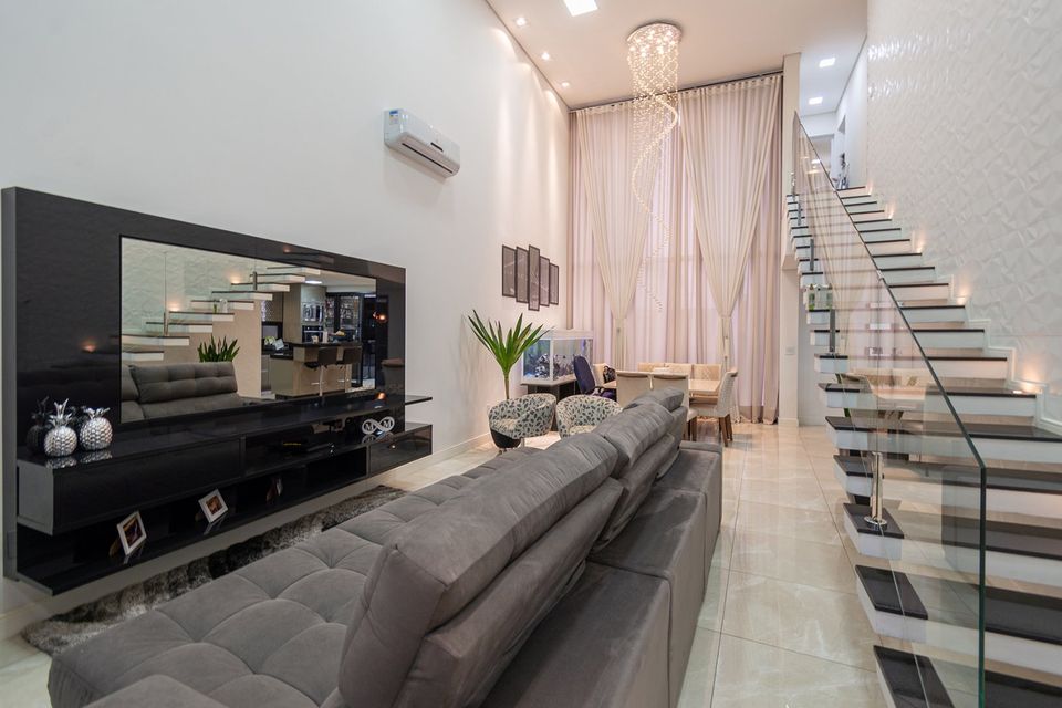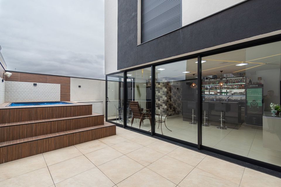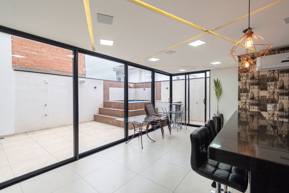 Sobrado localizado em condomínio de Hortolândia/SP! O imóvel oferece porta da entrada principal de modelo pivotante, com 6m² de altura e inteiriça e a sala de estar é integrada com a sala de jantar com pé direito duplo, e tem um lustre de cristal com 4,5m². A cozinha é decorada com pastilhas laminadas, com armários de alta qualidade, uma ilha com o cooktop e armários e uma despensa. As três suítes têm os banheiros com cromoterapia, ar condicionado e janelas automáticas. Área gourmet equipada com chopeira e decorada com luz de Led, dois banheiros e uma hidromassagem com energia solar.