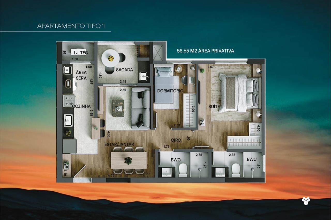 Com 58 m² de área privativa, ele entrega amplitude, fluidez entre os ambientes e uma planta inteligente que transforma cada detalhe em qualidade de vida.