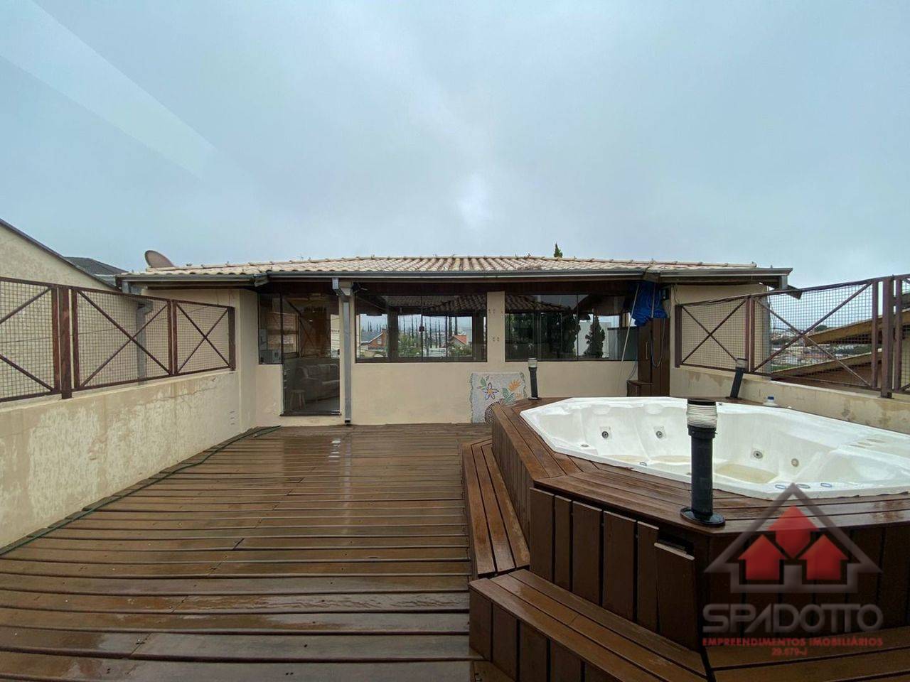 Piso superior 02 suítes, um deck com solário, banheira e um salão de festas com cozinha e banheiro.